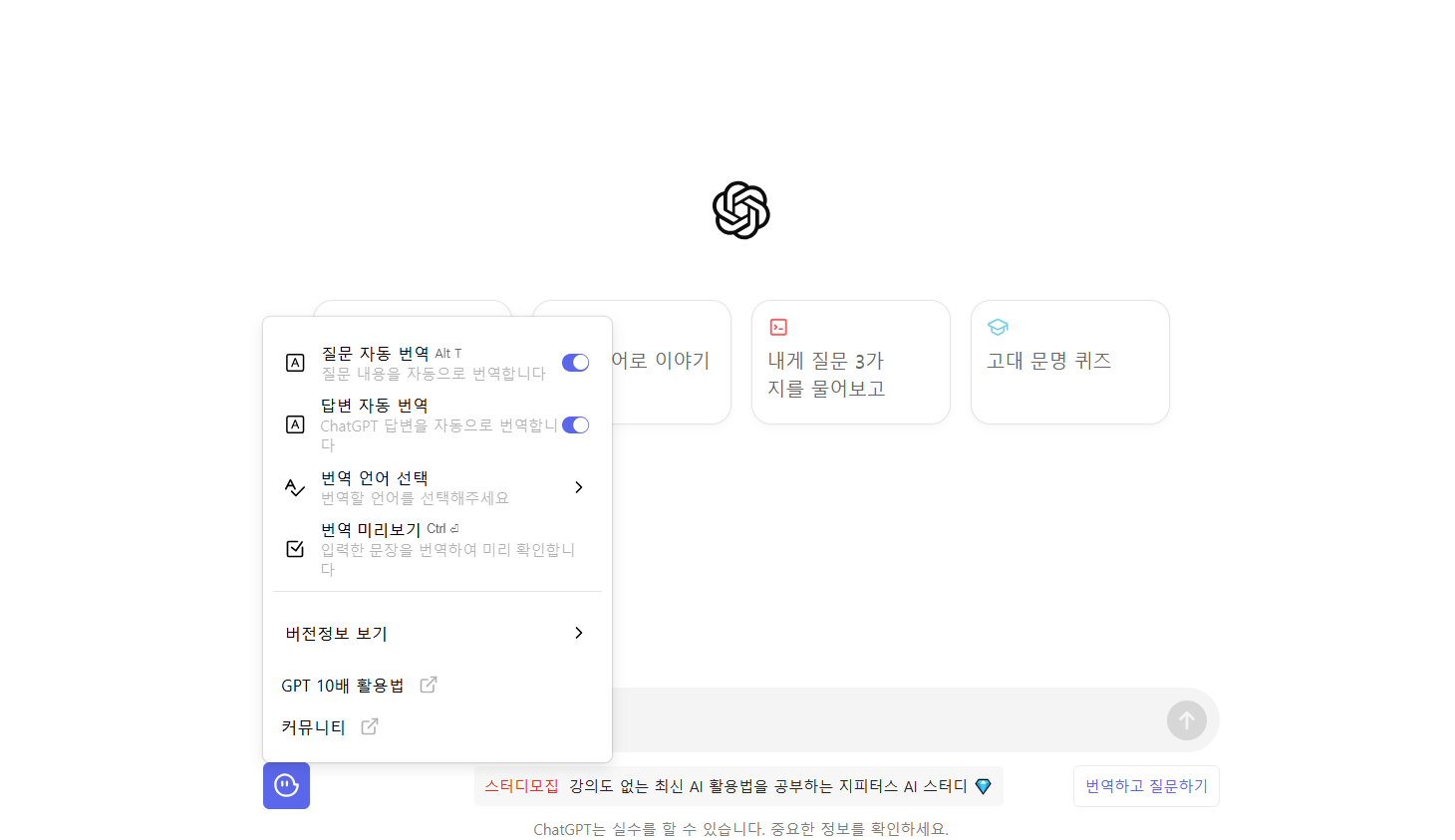 ⑧ 마지막으로 모든 방법을 사용 후에도 되지 않는다면 좌측 하단 말풍선 아이콘을 누른 후 번역 언어 선택 -> 한국어로 지정하면 챗 GPT 한글 무료 사용법을 적용 가능합니다.