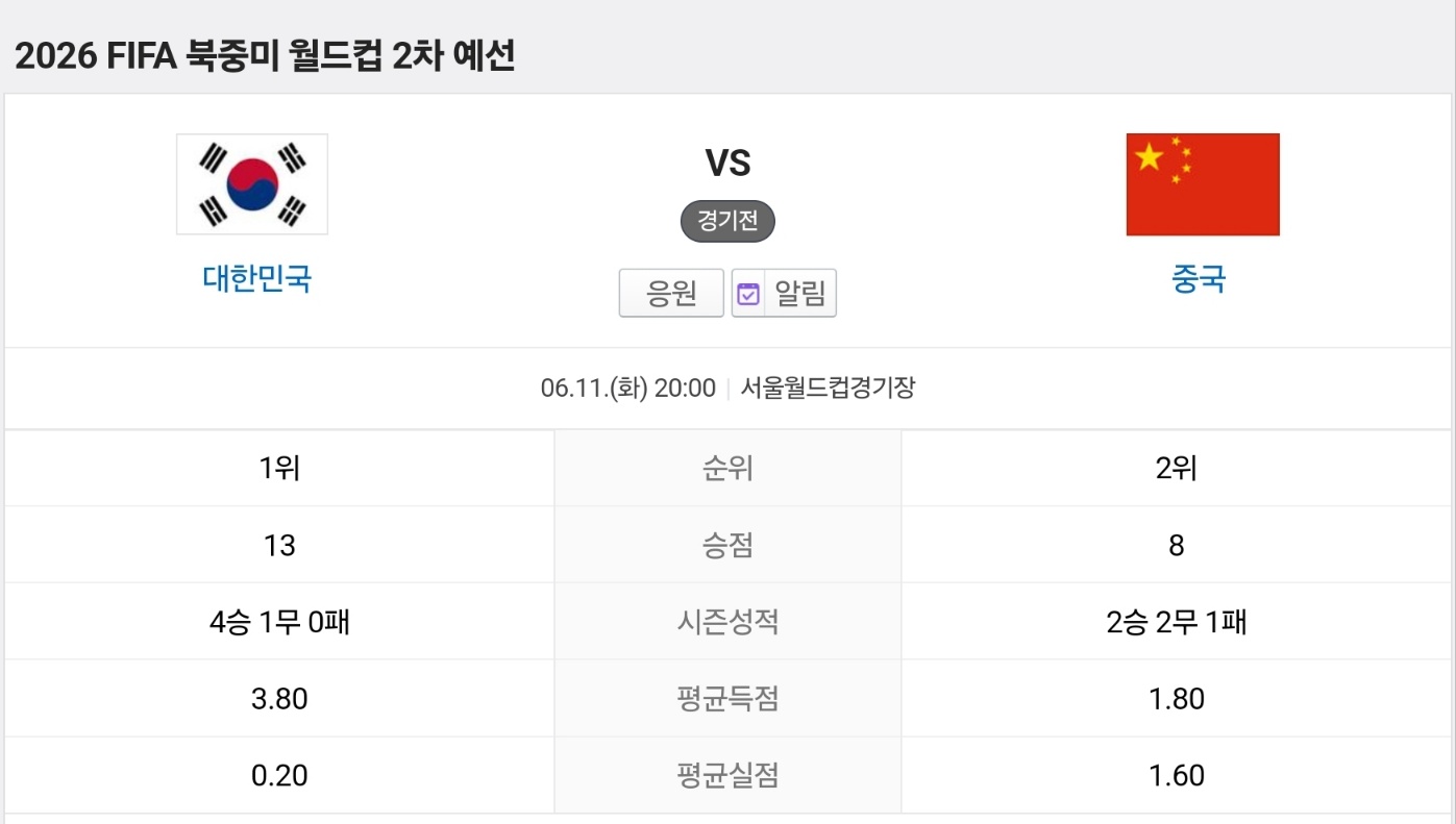 북중미 월드컵 2차 예산 대한민국 vs 중국 경기 일정
