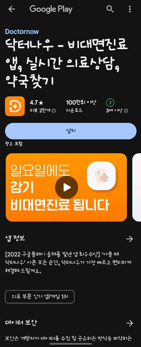 닥터나우란 비대면 진료 휴일 약국 찾기 등이 가능한 어플입니다.