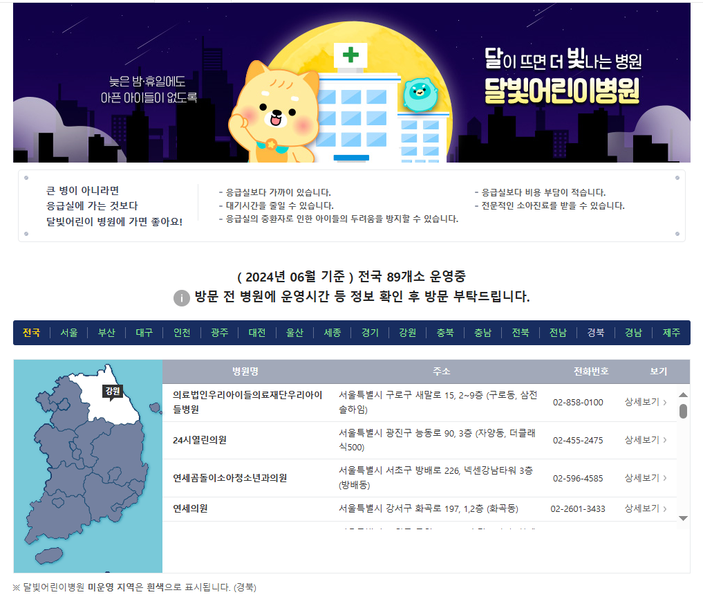 그럴 땐 당황하지 않고 달빛어린이 병원 홈페이지를 잡속하시어 찾으면 됩니다.